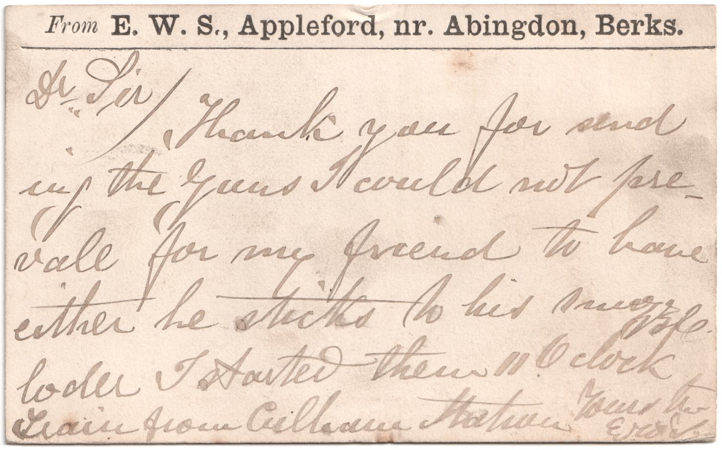 GE Lewis and Sons were a Gun and Rifle maker of some note. I can't entirely read this card but it does appear to mention guns. This is the earliest postcard I have from Abingdon