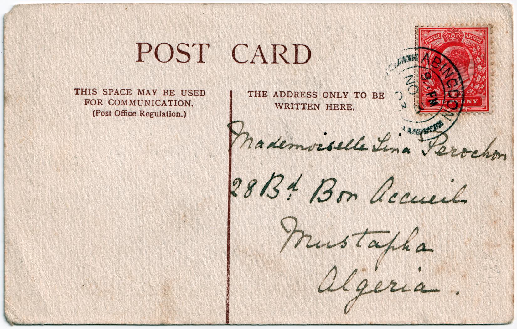 | Sent to | Madamoiselle Line Peroeho?, 28 Bd. Bon Accueil Mustapha, Algeria |