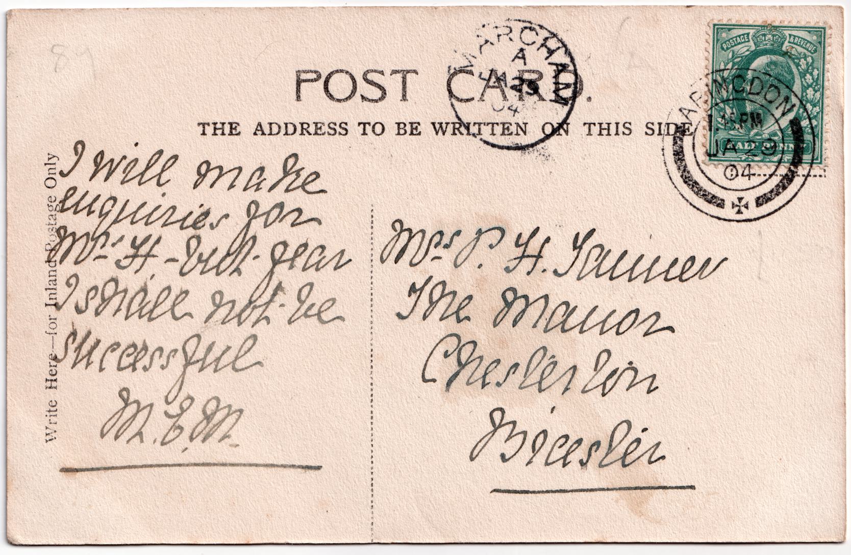 Philip Henry Tanner, a farmer's son, is listed on the 1901 Census as living at this address and being born in 1878. On the 1921 Census he's married to Mary Helene Tanner, born 1869 - she's the presumed recipient. See 19040313-ChristsHospital and 19040605-Steventon.