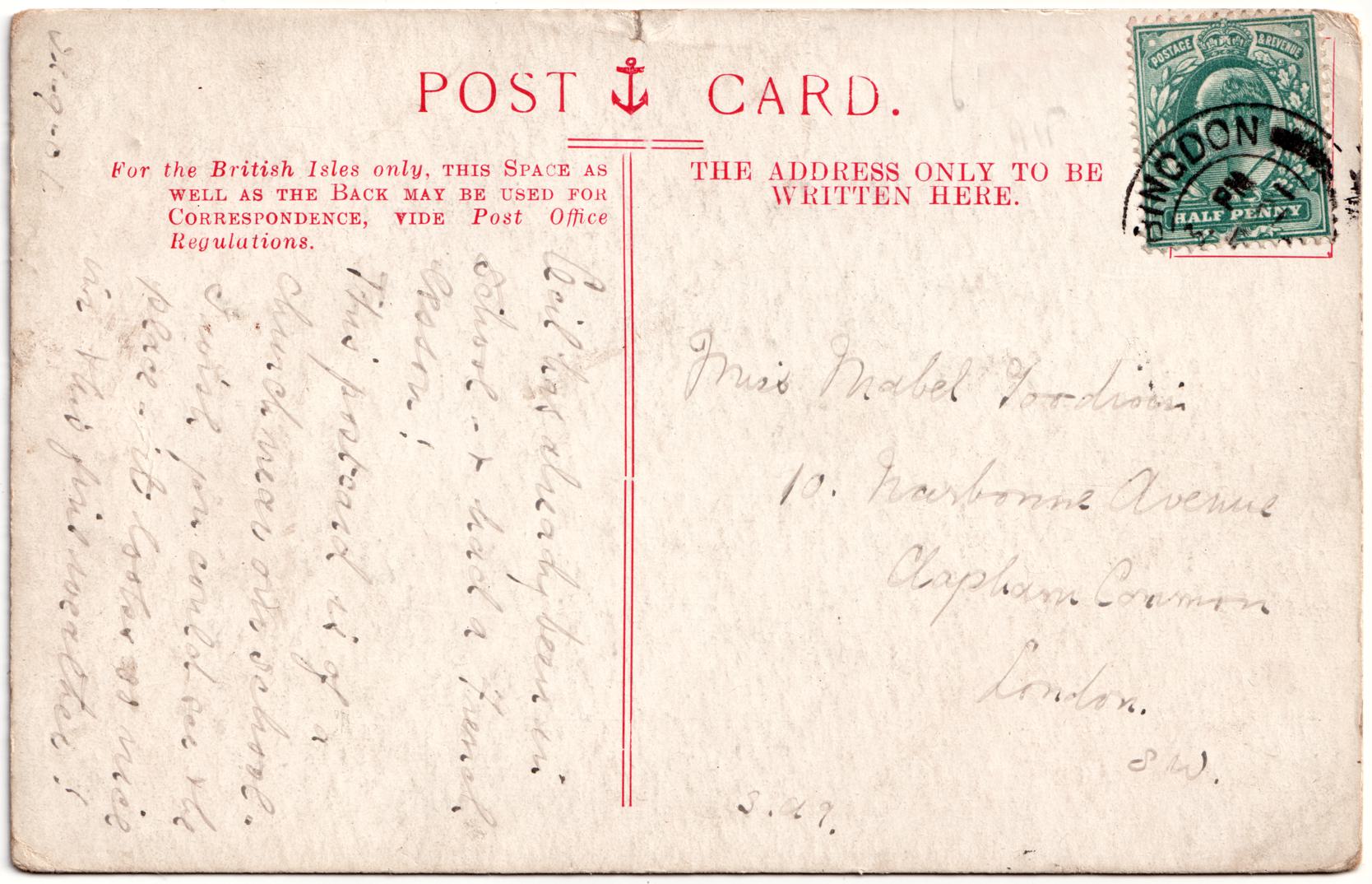 The 1901 Census has Mabel Goodwin, born 1894 living at this address. By 1911 she's listed as school teacher living in Croydon. Although the postmark is obscured, the sender has helpfully written a date in the corner of the card.