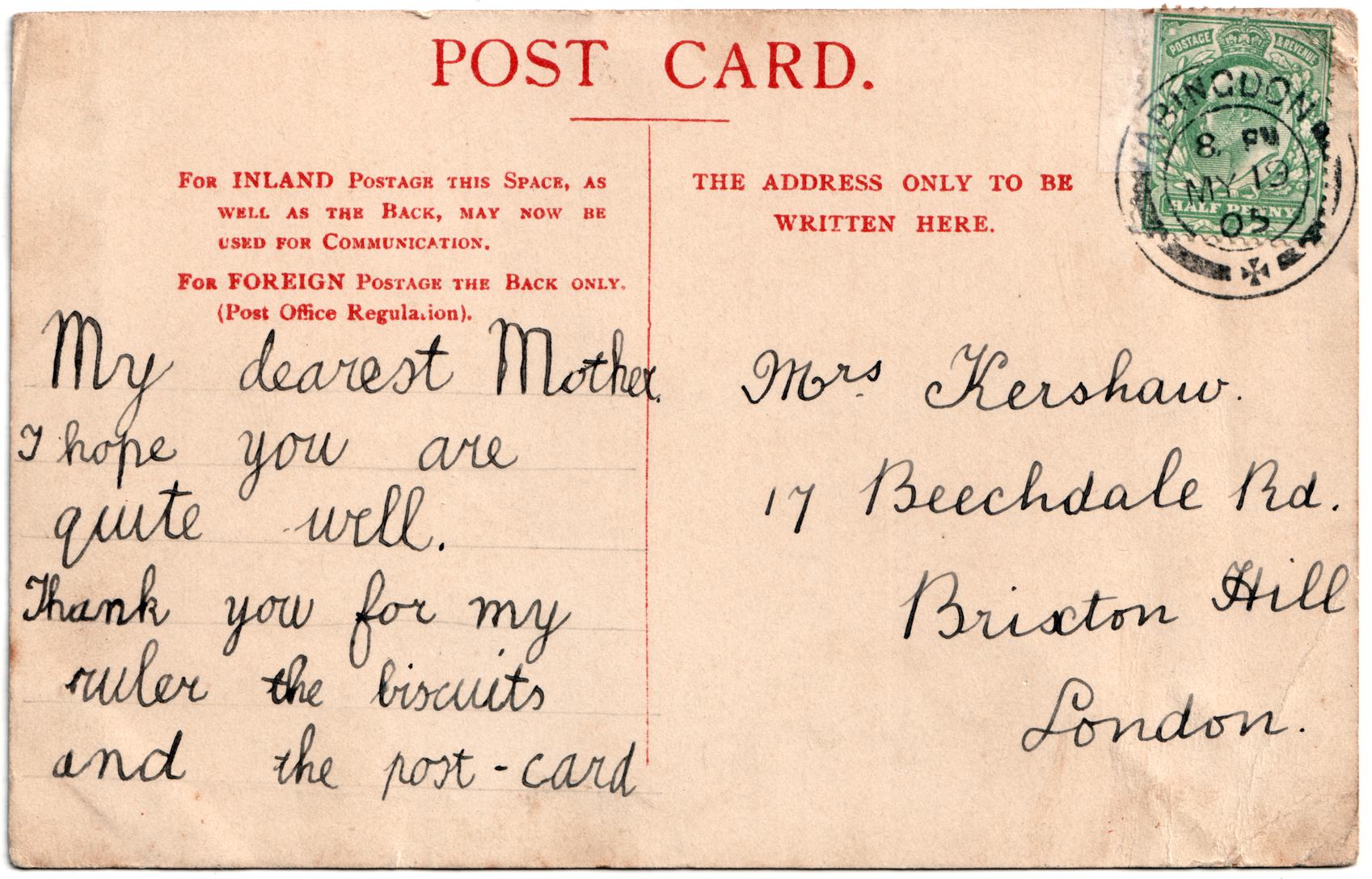 | Sent to | Mrs Kershaw, 17 Beechdale Rd. Brixton Hill, London |