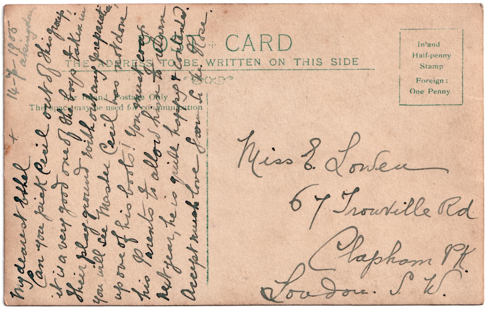 | Sent to | Miss E Lowen, 67 Trouville Rd. Clapham Park, London SW. |