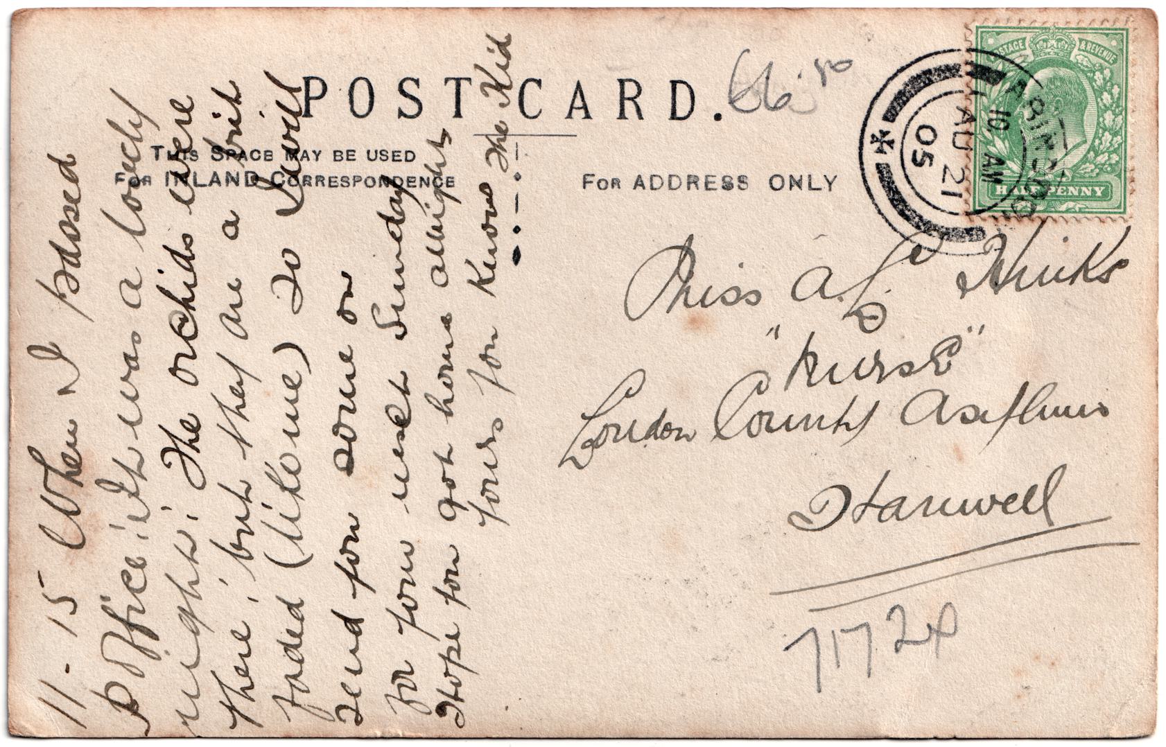 | Sent to | Miss ? Hicks? "nurse" London County Asylum, Hanwell |