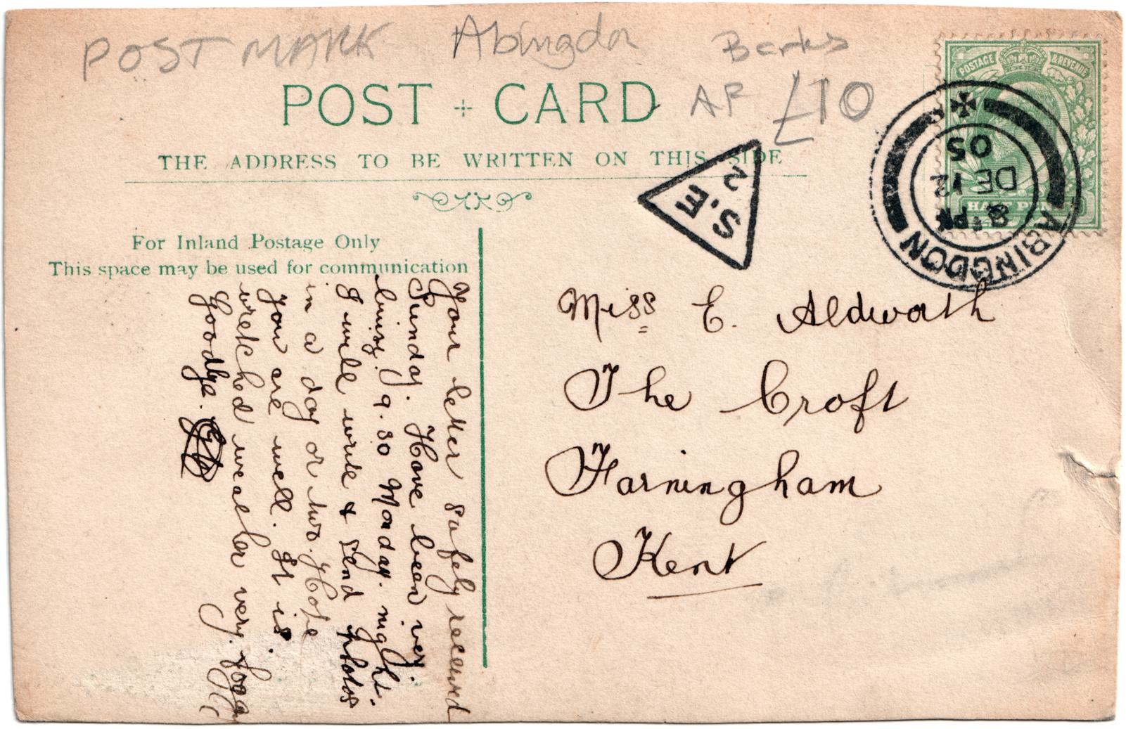 Worth comparing this to CC97/02017 in the Henry Taunt Collection, which is a very similar view dated to 1877. The sender appears to have scratched off Warland Andrew's name in order to give themselves more space to write a message. See also the near identical 19050717-AbingdonLookingEast