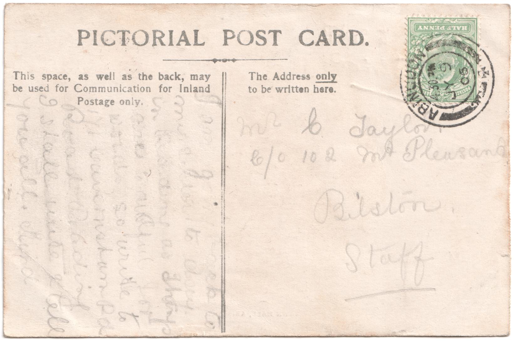 | Sent to | Mr C Taylor, c/o 102 Mt Pleasant, Bilston, Staff |
