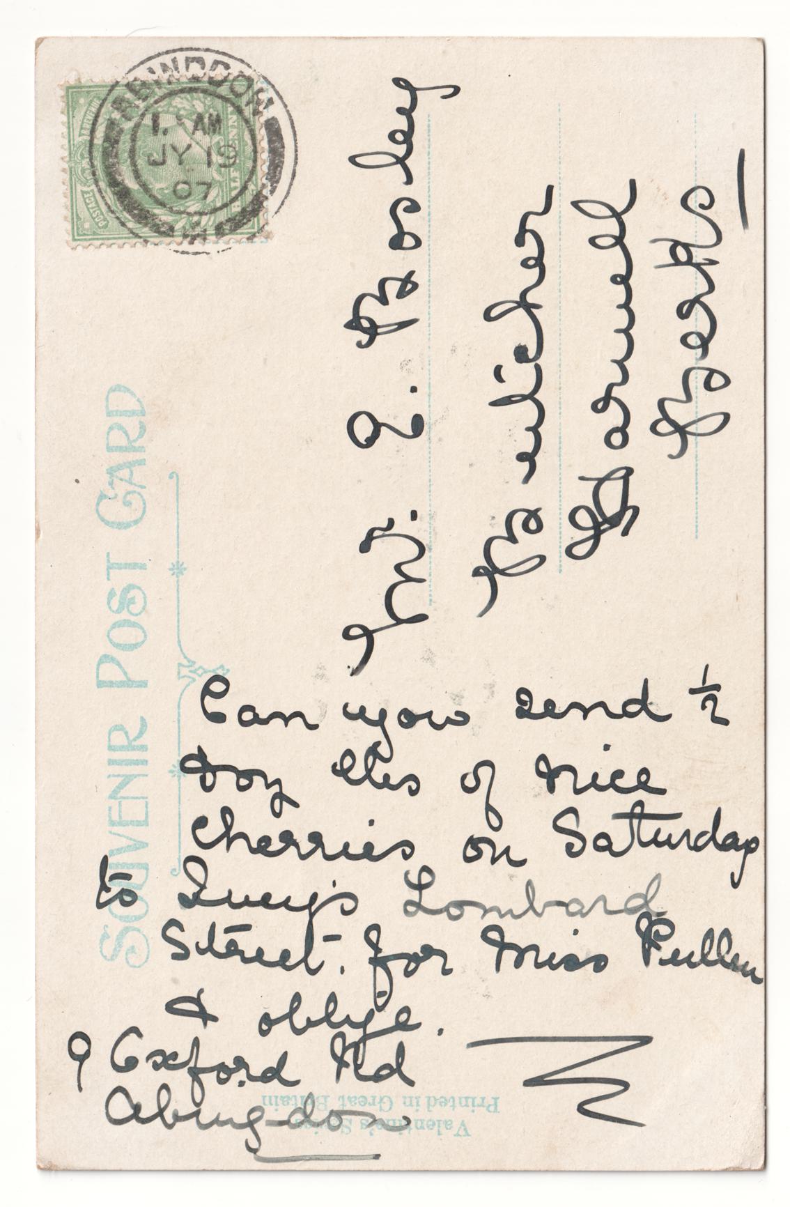 Sent from 9 Oxford Road, Abingdon - probably the same sender as 19090821-Comp. The postcard appears to be requesting some cherries to be delviered to Ivey's Lombard Street. Kelly's directory of 1905 lists Ivey Joseph, baker, at 6 Lombard Street.