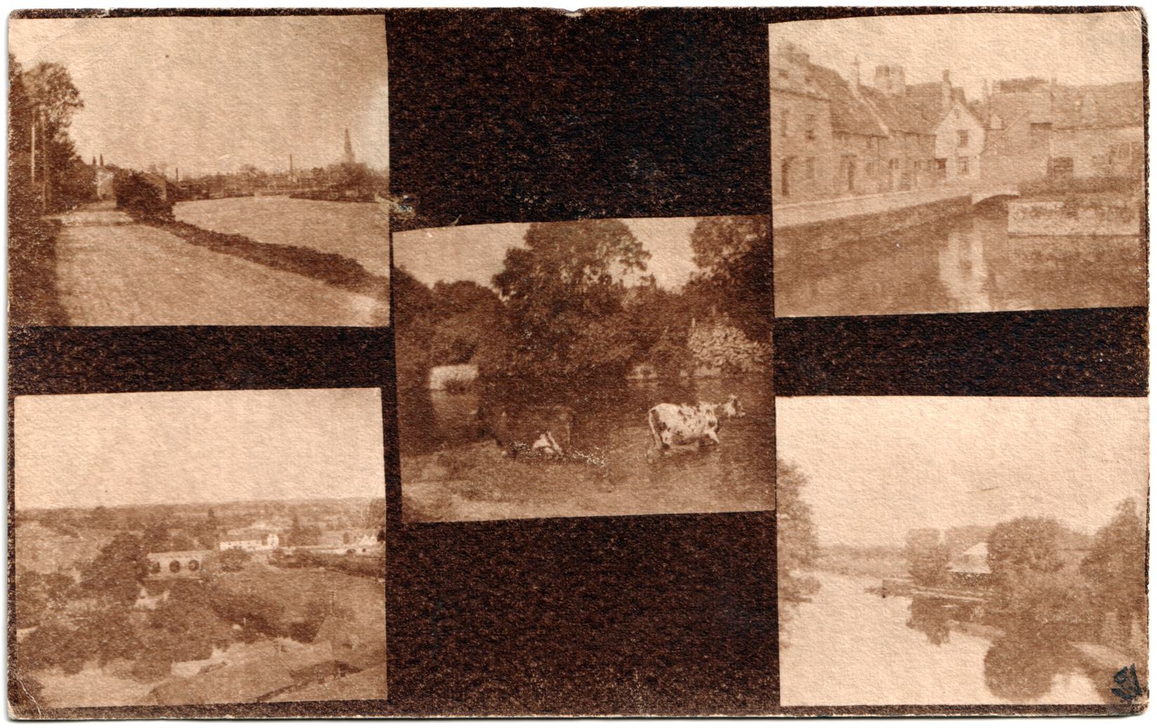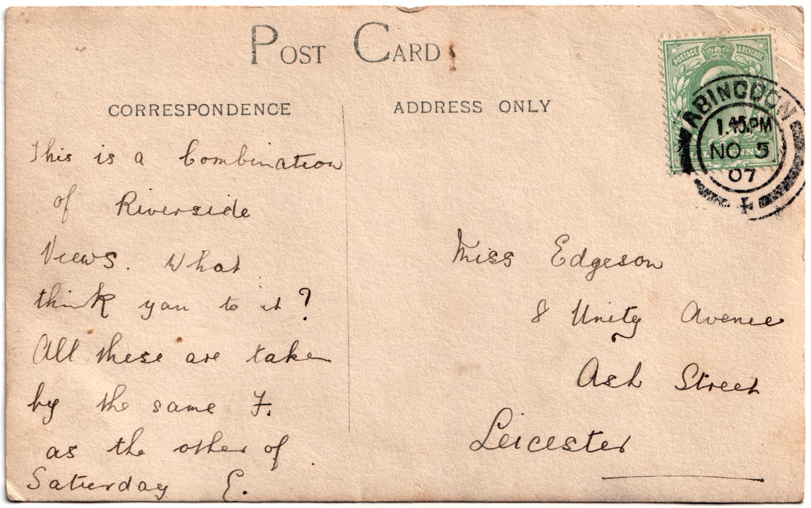 I'm not sure who produced this card (see also 19071104-Multiview). One photo appears to have been used by Frank Smith (AbbeyMill.html">19080121-AbbeyMill) - it's possible this card was produced by him. Sent by Edith Mary Barrett of 12 Marcham Road, to Nellie Gamble Edgson of Leicester. Edith's brother Paulin would marry Nellie in 1912.