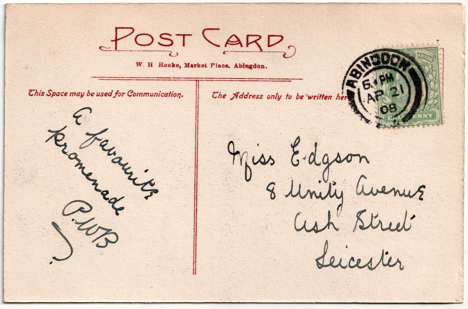 | Sent to | Miss Edgson, 8 Unity Avenue, Ash Street, Leicester |