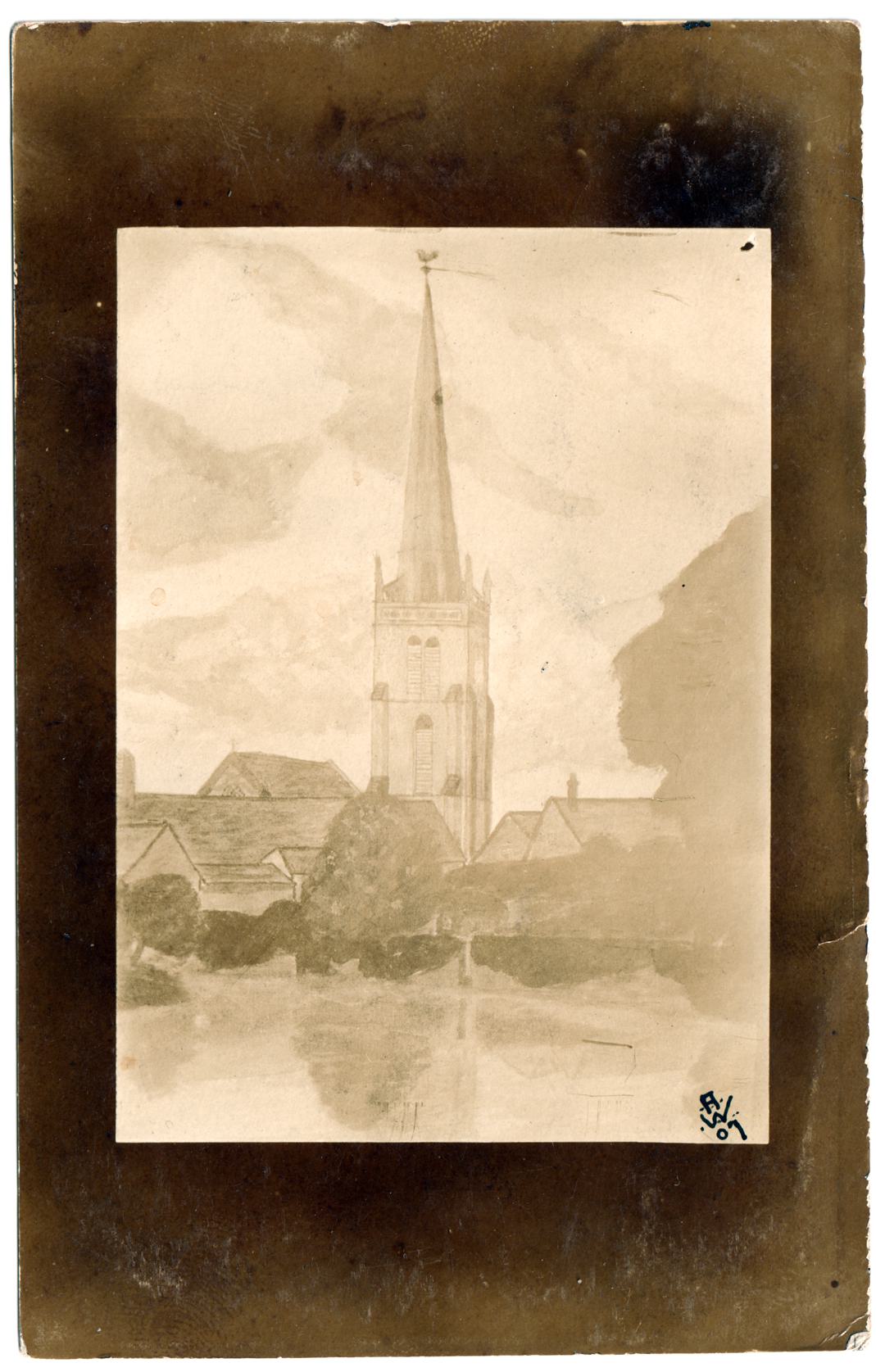 | Message | This is a photograph (taken from a painting) of our old Parish Church. very pretty old Place many centuries old. ? Regards to you and Mrs E. Yours EMB. |