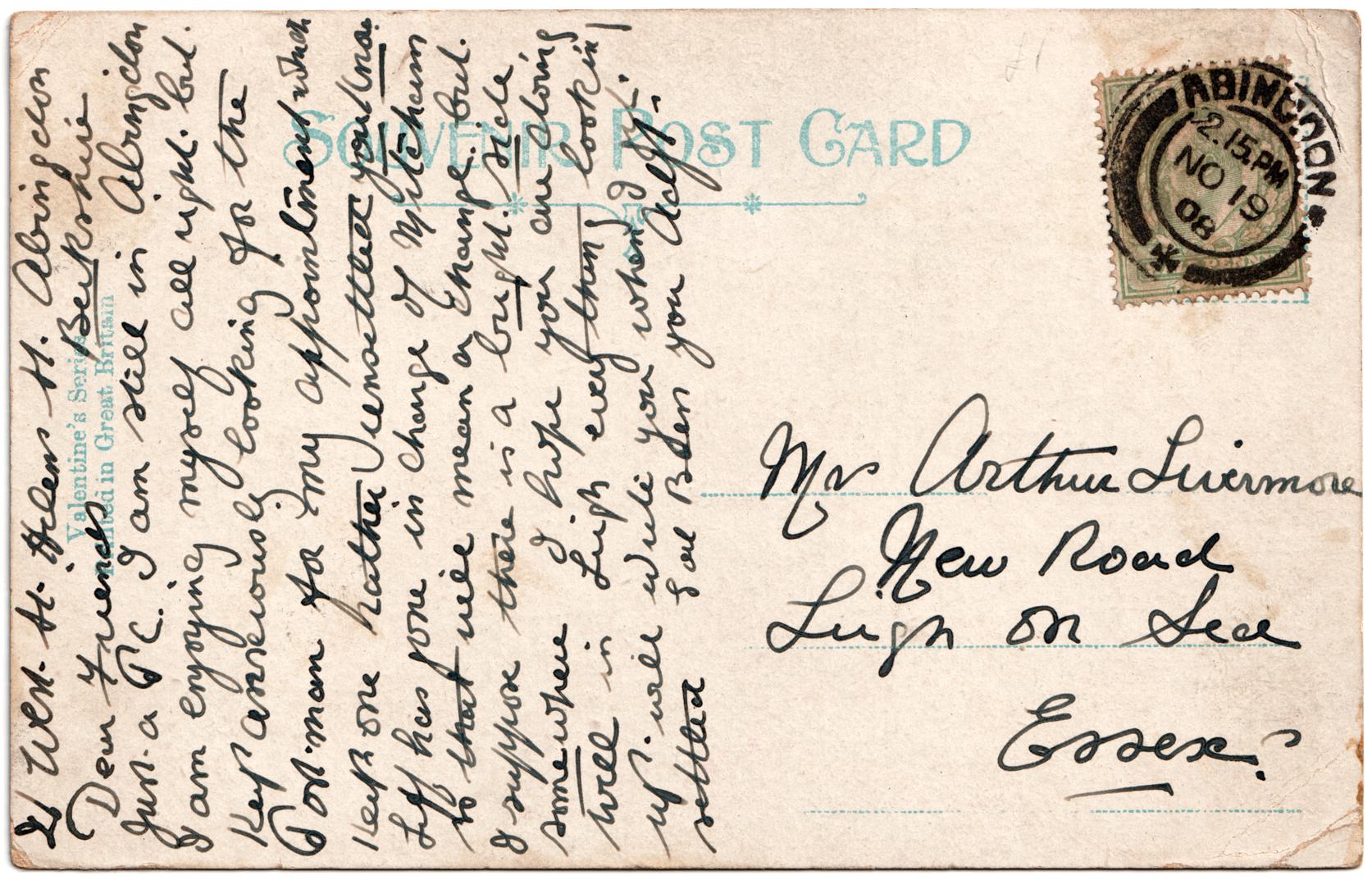 | Message | Dear Friends, just a PC. I am still in Abingdon. I am enjoying myself alright but keep anxiously looking for postman for my appointment which left one rather unsettled you know. Geff has gone in charge of Mitcham, so that will mean a change but I suppose there is a bright side somewhere. I hope you are doing well in Leigh every thing looking up. Will write you when I am settled. God bless you all. |