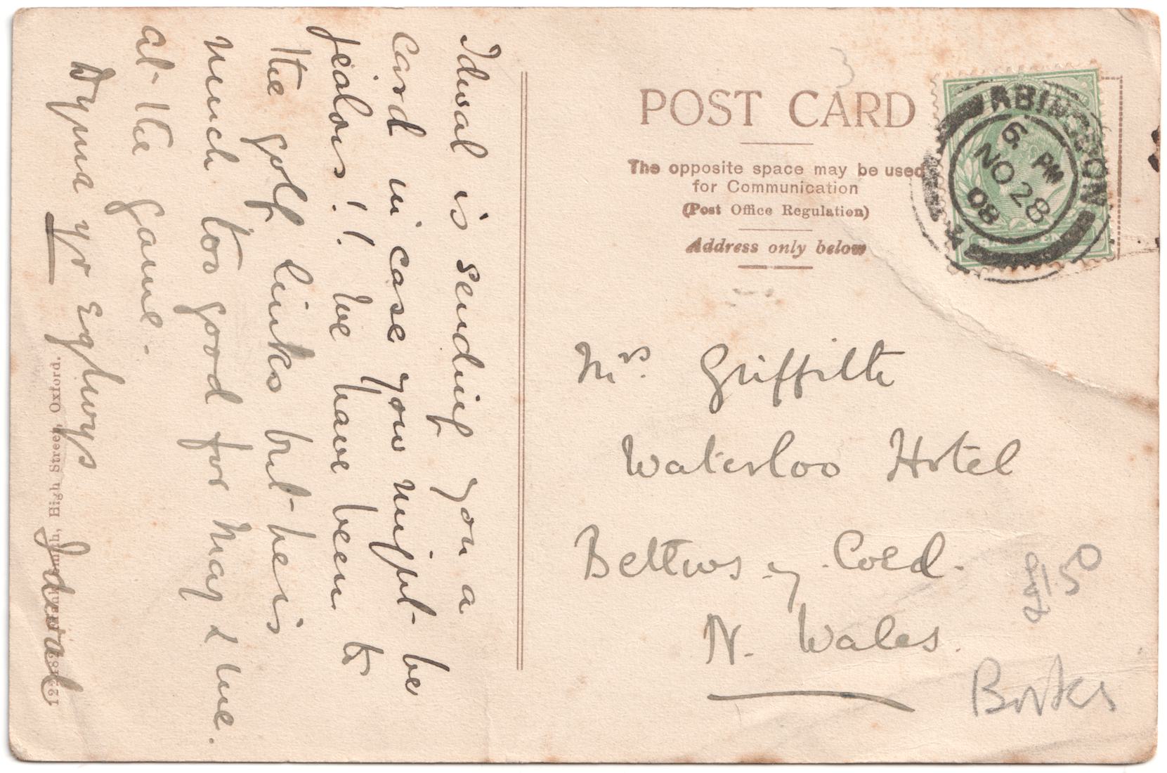 Idwal isn't the most common Welsh name. There's a record of an Idwal Owain Griffith marrying Alice Godfrey Isaac (daughter of TW Player Isaac of Barton Court) in Abingdon in 1909 and this is almost certainly the sender of this card. Idwal worked at the University of Oxford where he studied physics, astronomy, and spectroscopy. During the First World War he served in the Royal Flying Corps and RAF where he developed early night flying techniques. His obituary describes him has showing "sweet reasonableness and a patience" and that he enjoyed golf "where he was no mean performer".