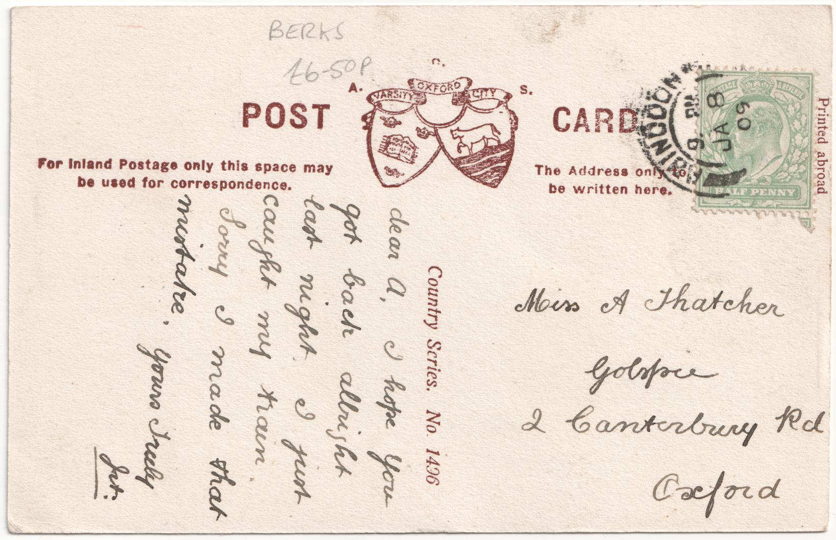 | Sent to | Miss A Thatcher, Golspice?, 2 Canterbury Rd, Oxford |