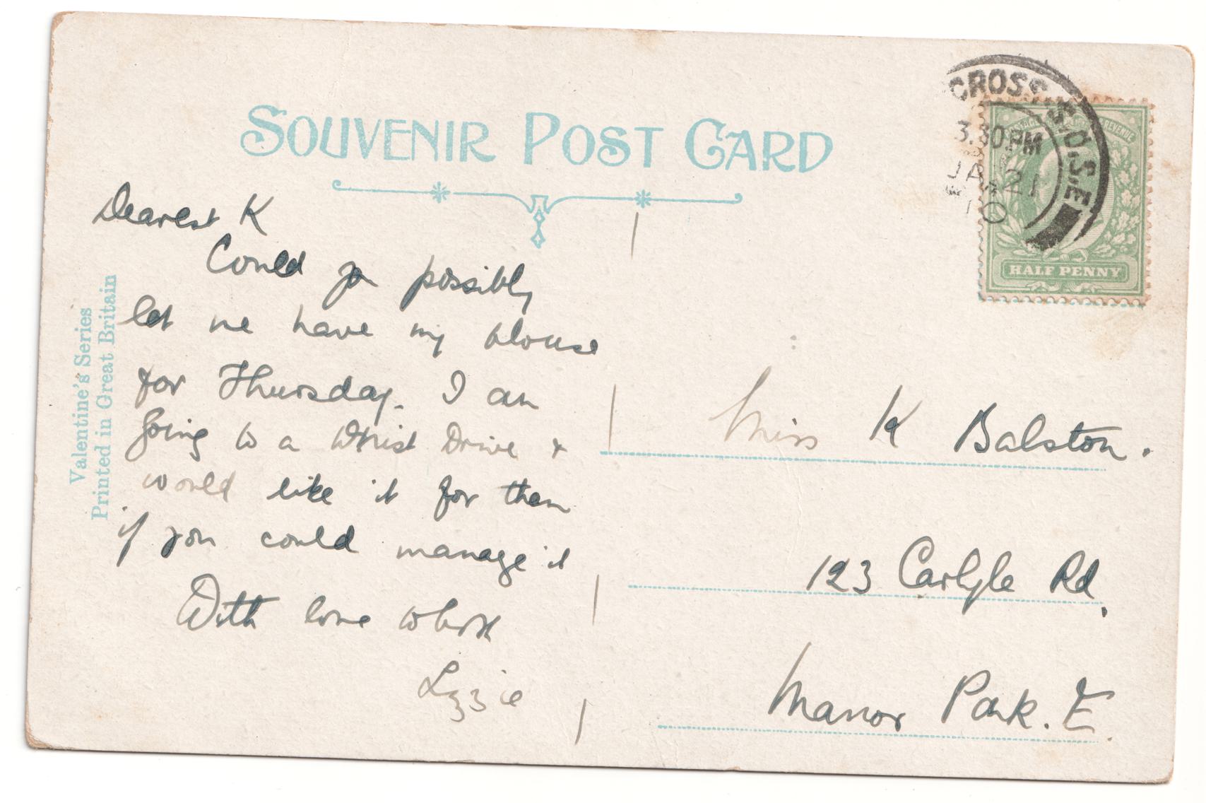 | Message | Dearest K, Could you possibly let me have my blouse for Thursday. I am going to a whist drive and would like it for them if you could manage it. With love from Lizzie |