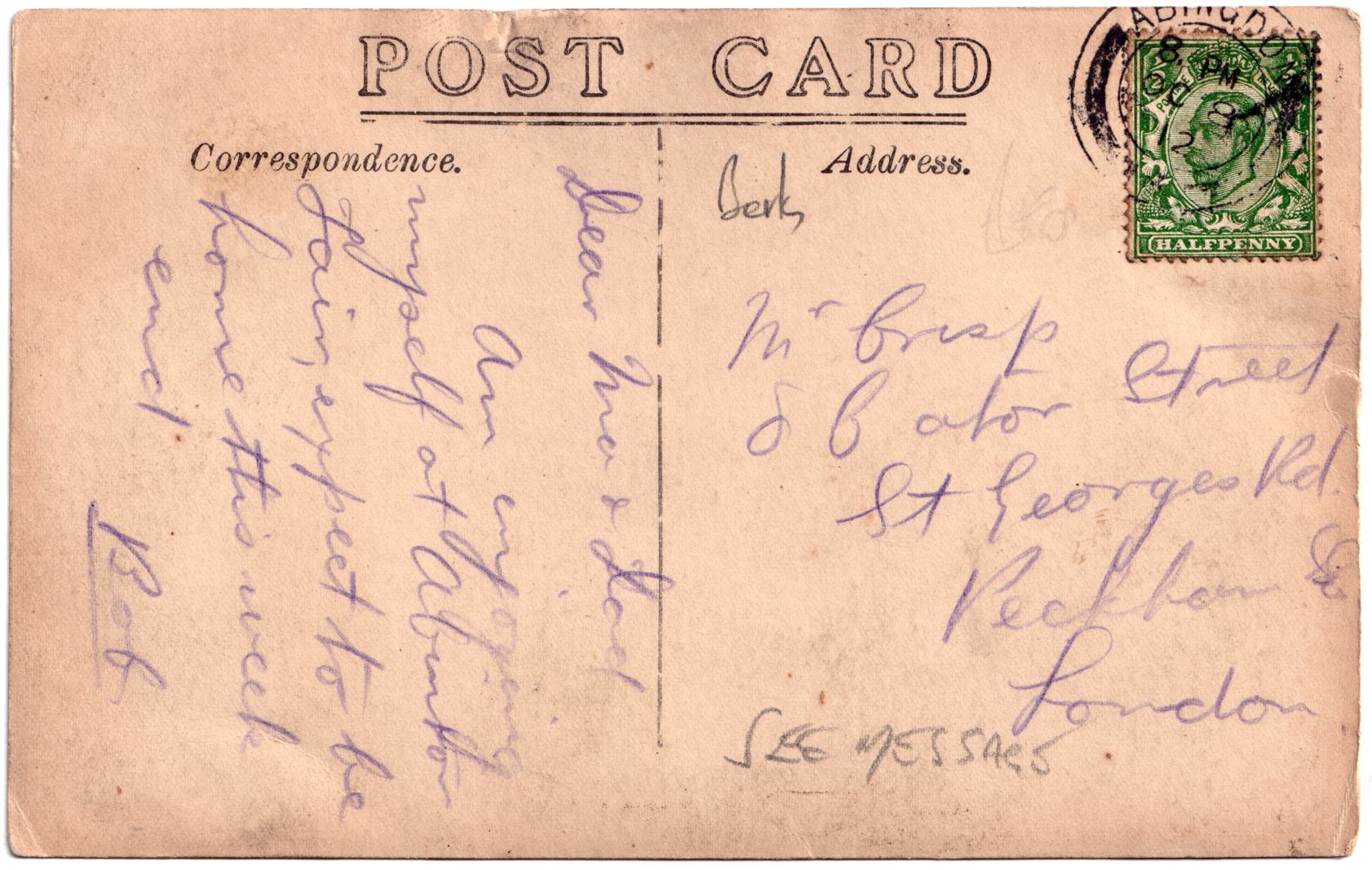 | Message | Dear Ma and Dad. Am enjoying myself at Abingdon fair, expoect to be home this weekend. Bob. |