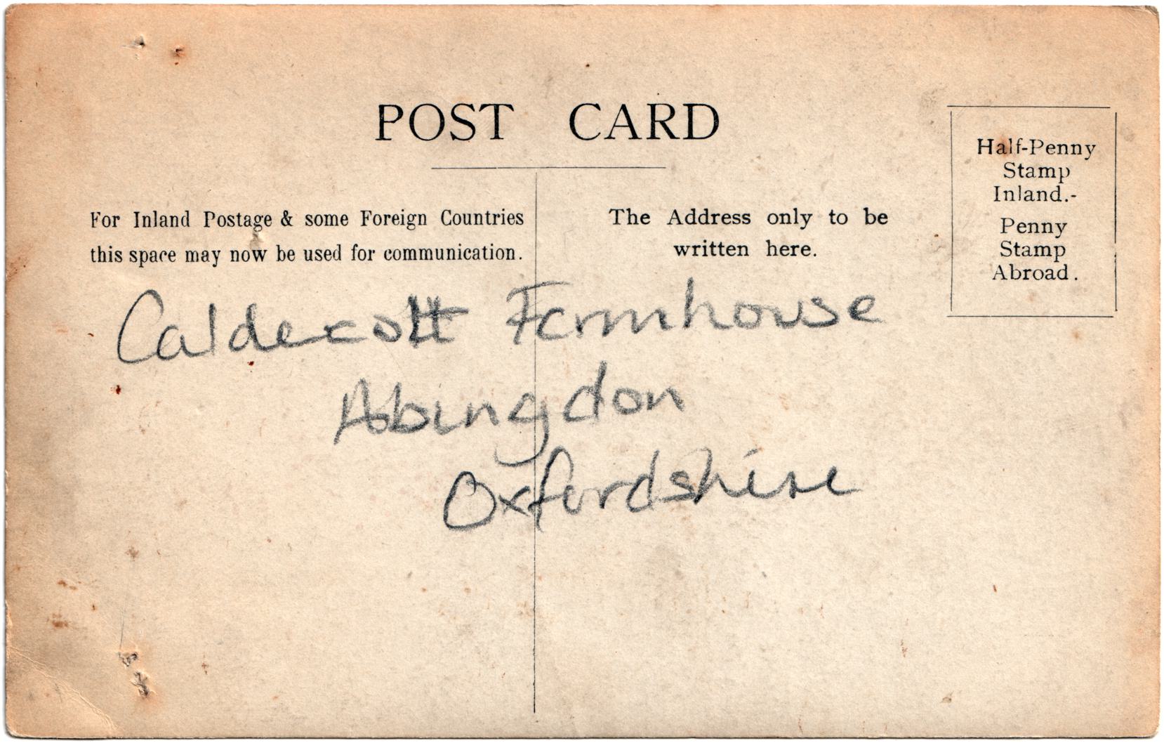 Undated, the postage rates mean that this card is pre-1918. The card depicts Caldecott Farm House, which was situated roughly where the entrance to Suffolk Way/Ashville Trading Estate. Note the dog sleeping outside the building.