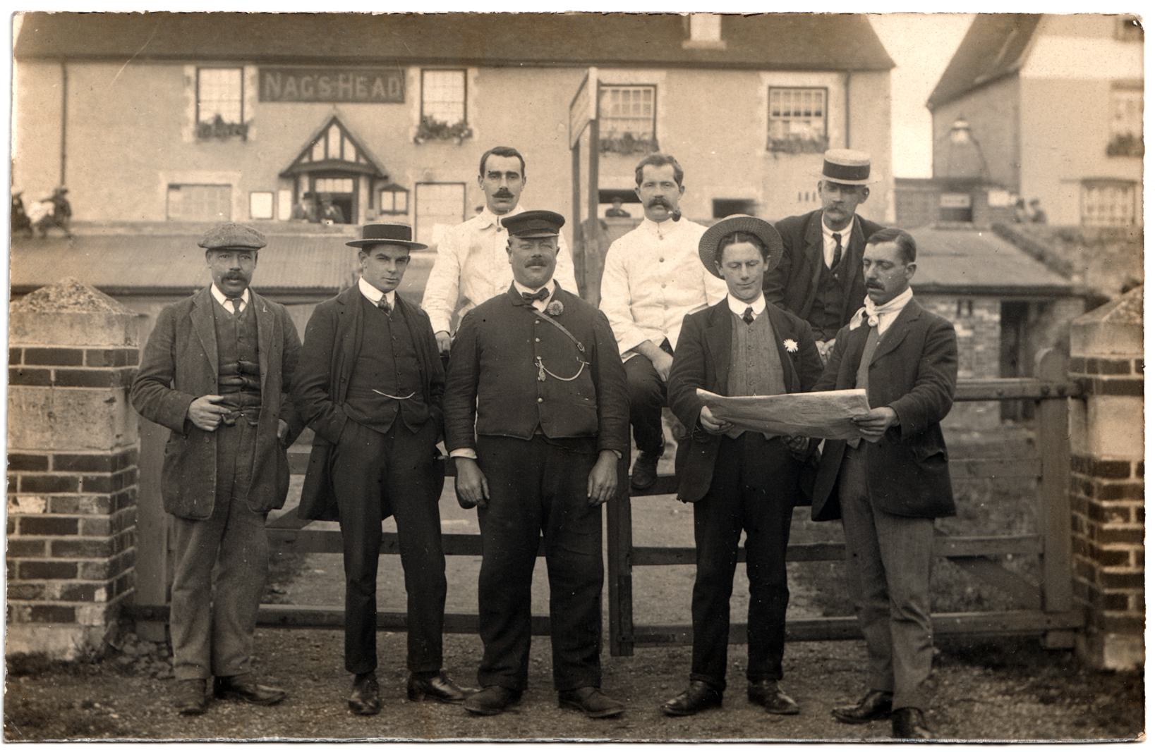 I'm not really sure what occasion this postcard might have been taken for. The view of the Nag's Head is consistent with other Edwardian postcards and the half-penny postage rate certainly dates the card to pre-1918. Eight men have gathered for the photo. One man is dresssed like like a ticket inspector of some kind, and two men at the back look like they may be chefs or kitchen staff. Two working-class men are on the far left and right, and two of the men appear to be reading a newspaper.