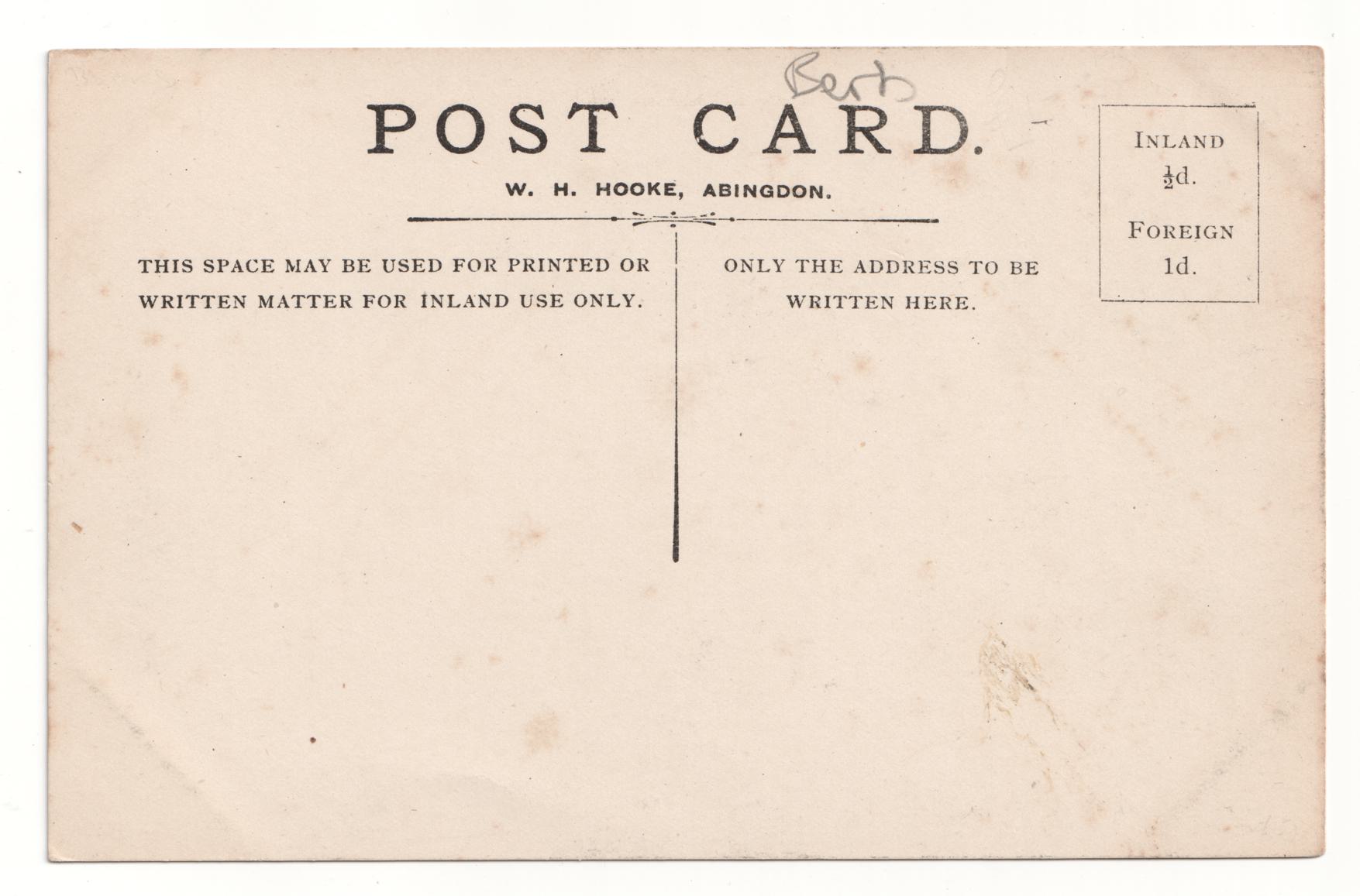 The reverse of an old postcard. The postcard is of Abingdon: St. Helen's Church and the Almshouses