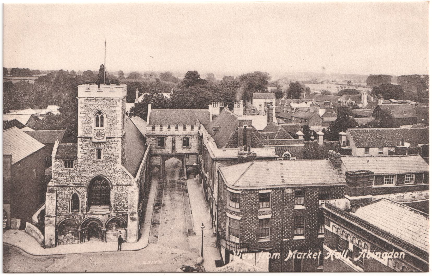 This unposted card has a serial number (just visible in the surface of the road) that dates it to 1896. Taken from the roof of the county hall, it shows a view towards the Abbey Gateway. The church clock looks like it reads as 10:25. The now demolished "Butcher's Row" that enclosed the guildhall courtyard is visible, as is the very edge of the building on Stert Street that was home to Warland Andrew's photo studio.