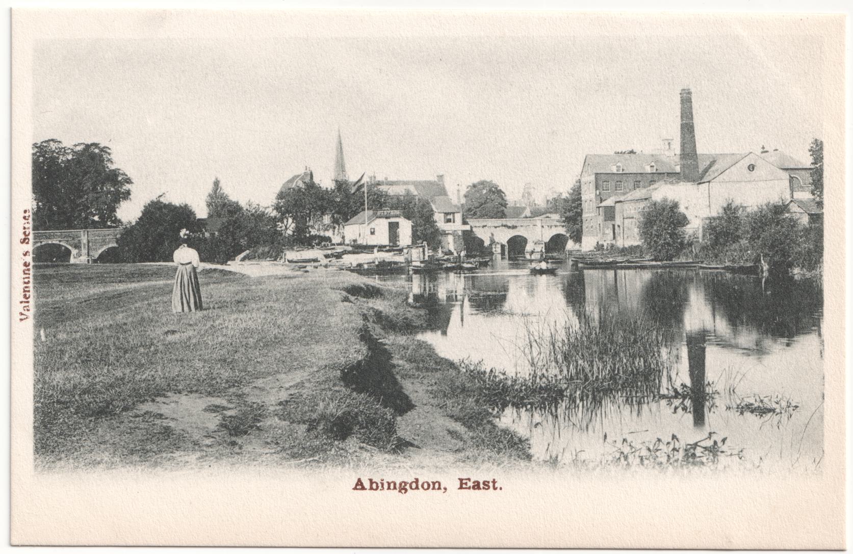 Valentine's registers date this image to 1896 and the card is of a format most similar to the earliest divided cards I've collected from them, posted in 1903. A woman in Edwardian Dress is looking upon the same scene as the photographer, with the bridge, factory, Nag's Head and Steven's Boat Yard.