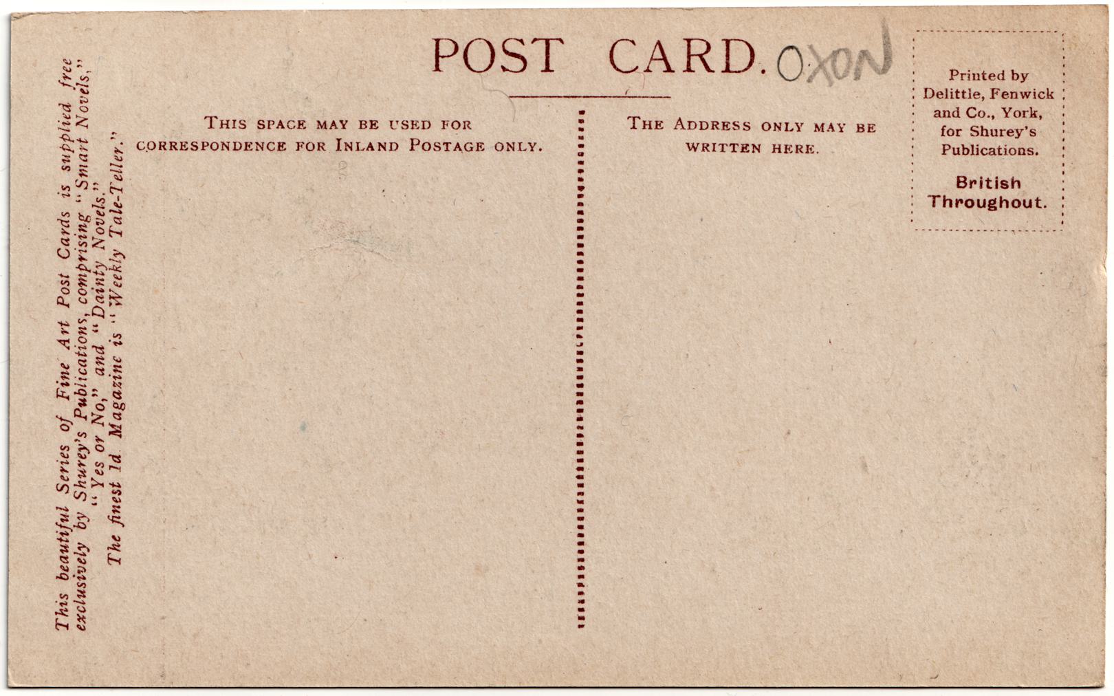 Shurey pubilshed a series of postcards that were included with various 'penny dreadful' magazines that included serialised stories. This photograph is dated from 1901 and I have examples in my collection of it appearing on divided and undivided postcards. This photograph appears to be from the Valentines series. See 19030406-MarketPlace.