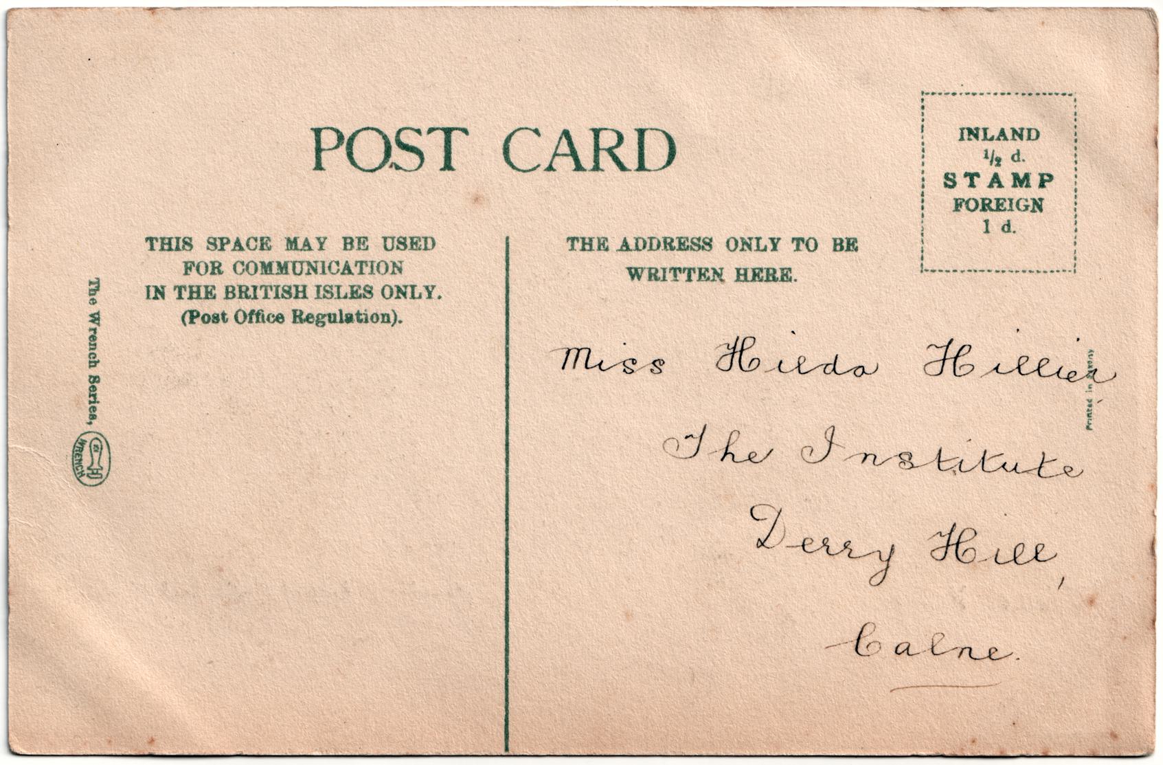 | Sent to | Miss Hilda Hillier, The Institute, Derry Hill, Calne |